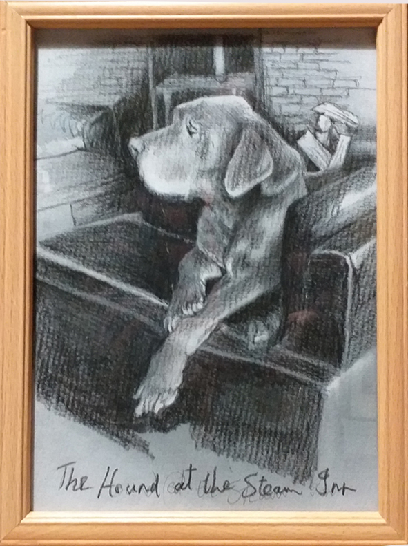 Julie and I were marooned in Mallaig waiting for the ferry to the Isle of Skye. We popped into The Steam Inn – a charming pub near the terminal. We noticed this battered sofa with no-one sitting on it. Then this blue great dane strolled in and settled on what is obviously HIS sofa